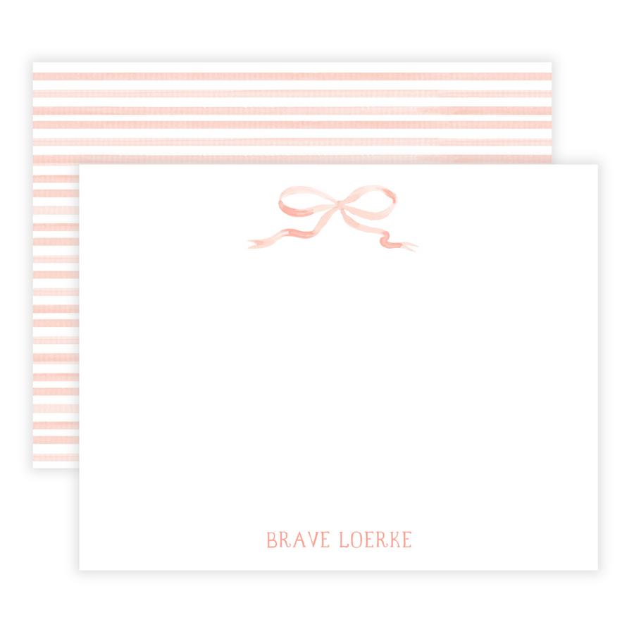 A sweet set of 15 flat note cards with a pretty blue bow and your name personalized at the top. The back of each card is printed in the coordinating blue stripe. Choose your font to be personalized in a coordinating blue ink. Font shown in sample is Monogrammer.