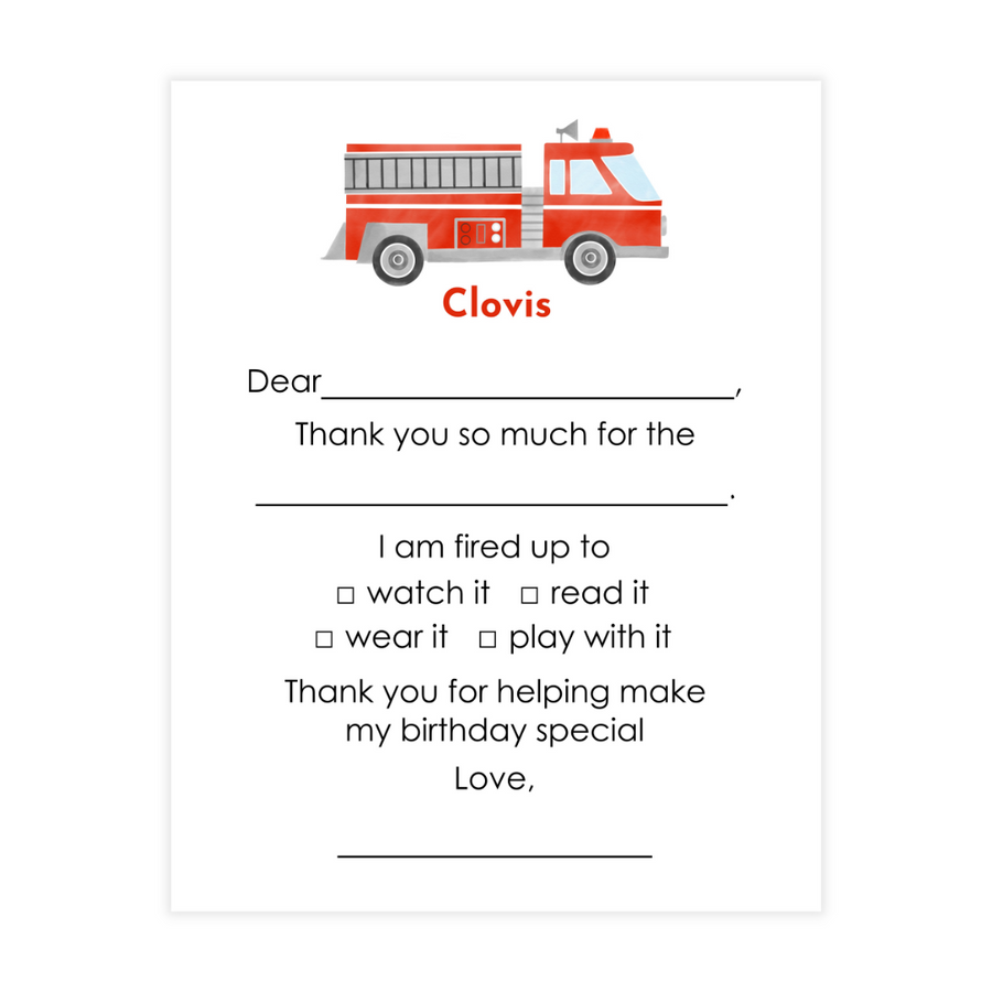 Firetruck Fill-In Thank You Note Cards