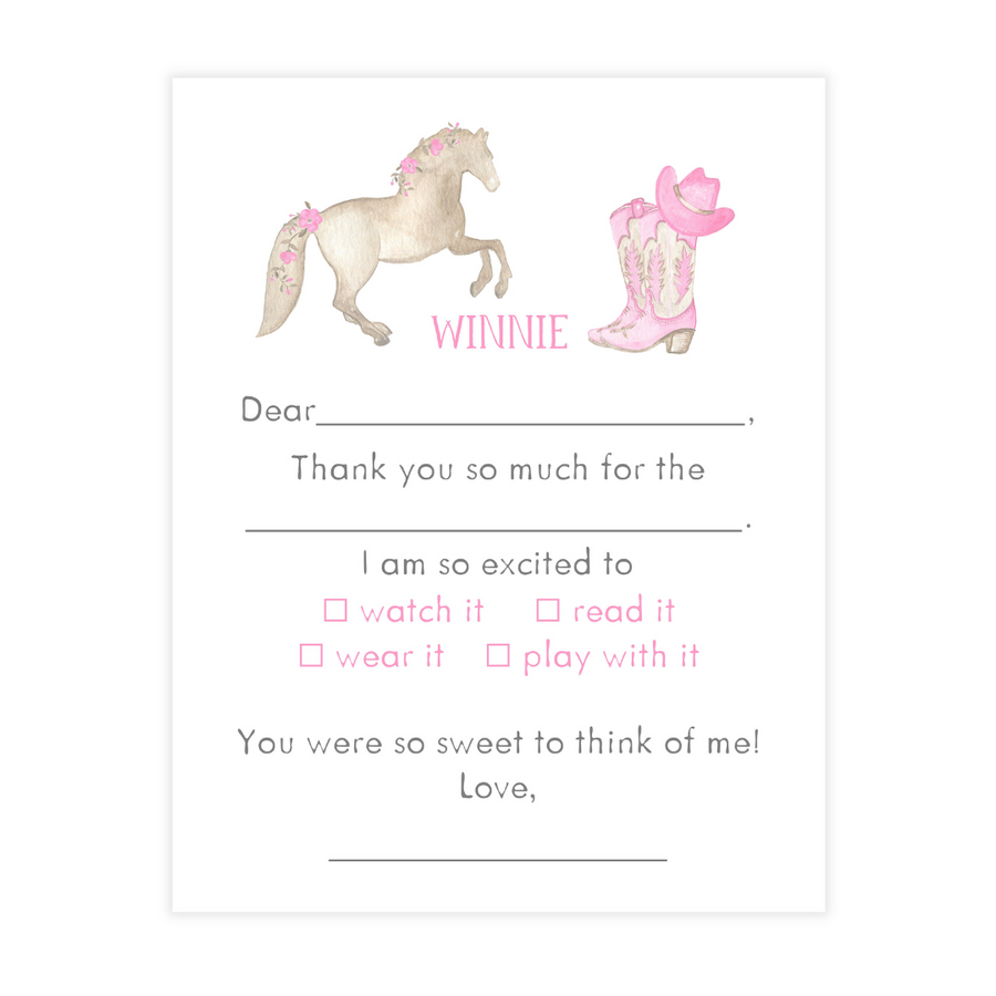 This set of 10 flat note cards features a fill-in style just for kids! Take away the frustration of writing a thank you note and instill a good habit that's fun instead! Personalized in a cute font in pink ink.