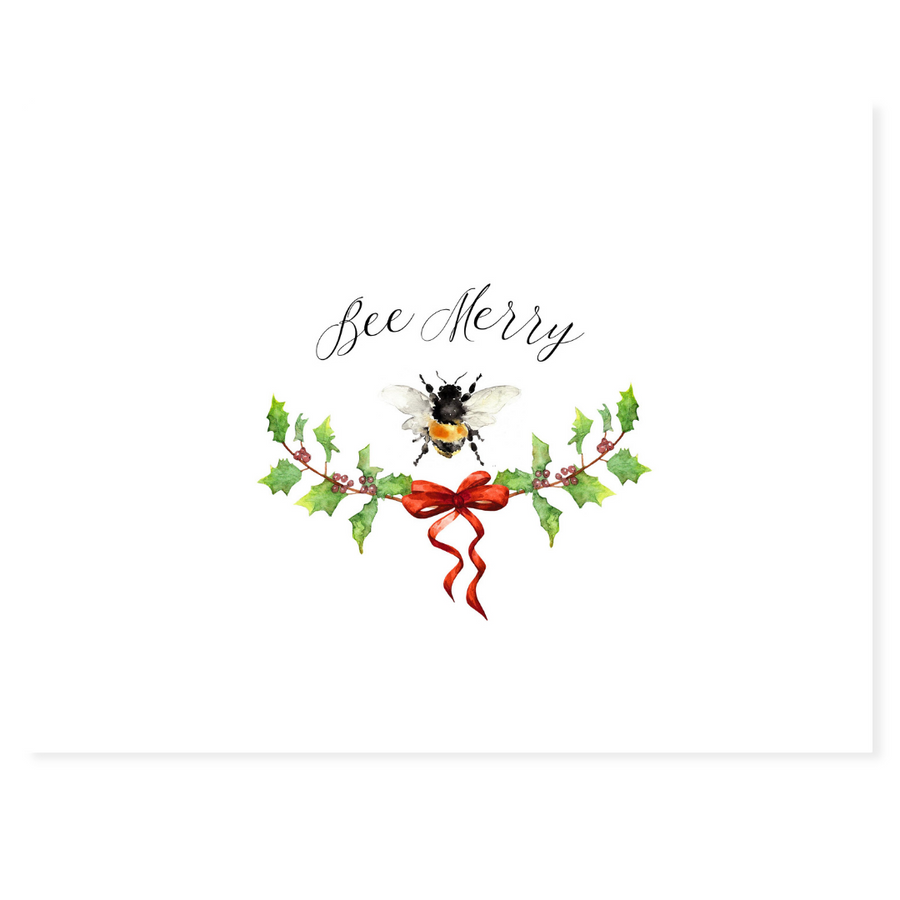 This collection of 10 folded note cards showcases a charming watercolor bee perched above a holly arrangement tied with a festive red bow. Spread holiday cheer with these delightful Bee Merry cards!