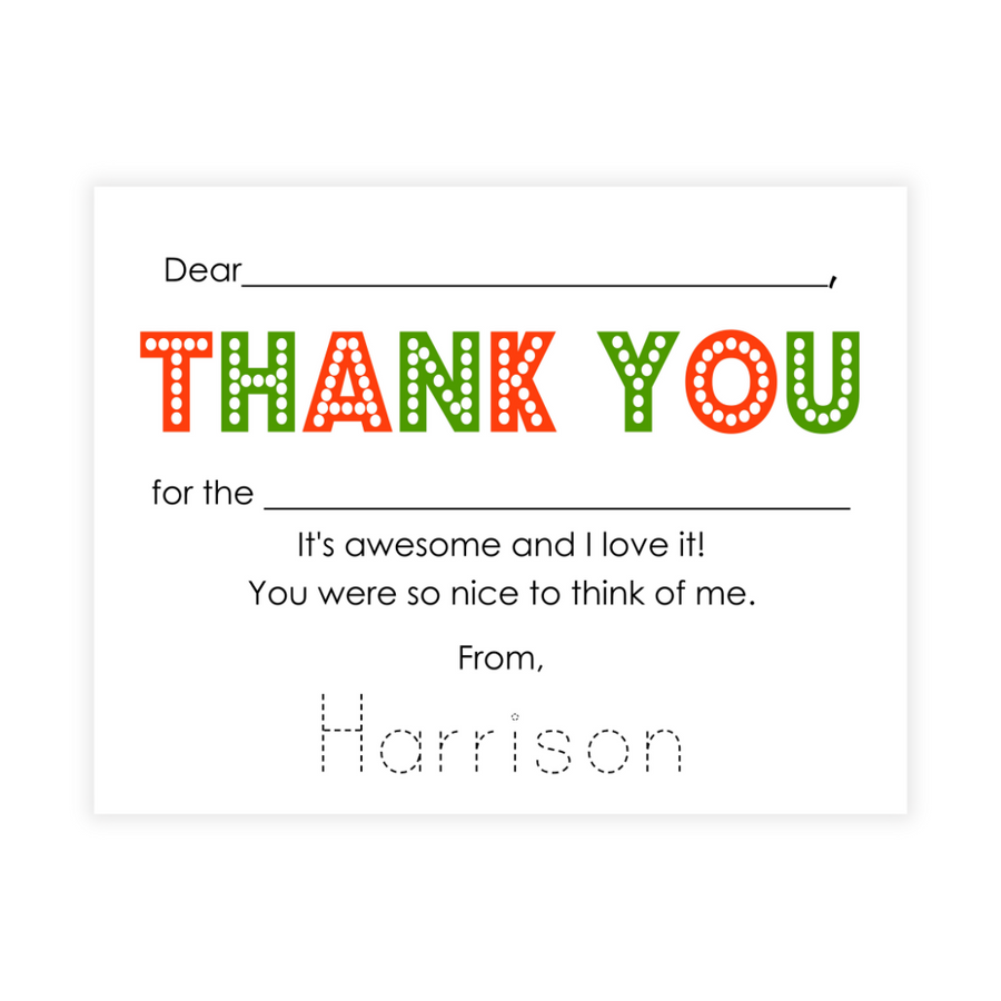 This set of 10 flat note cards features a fill-in style just for kids! Take away the frustration of writing a thank you note and instill a good habit that's fun instead! Personalized with a "dashed" font so kids can easily trace their name.