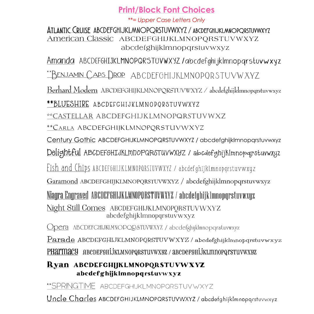 Please specify the personalization, font and color choice you would like printed.