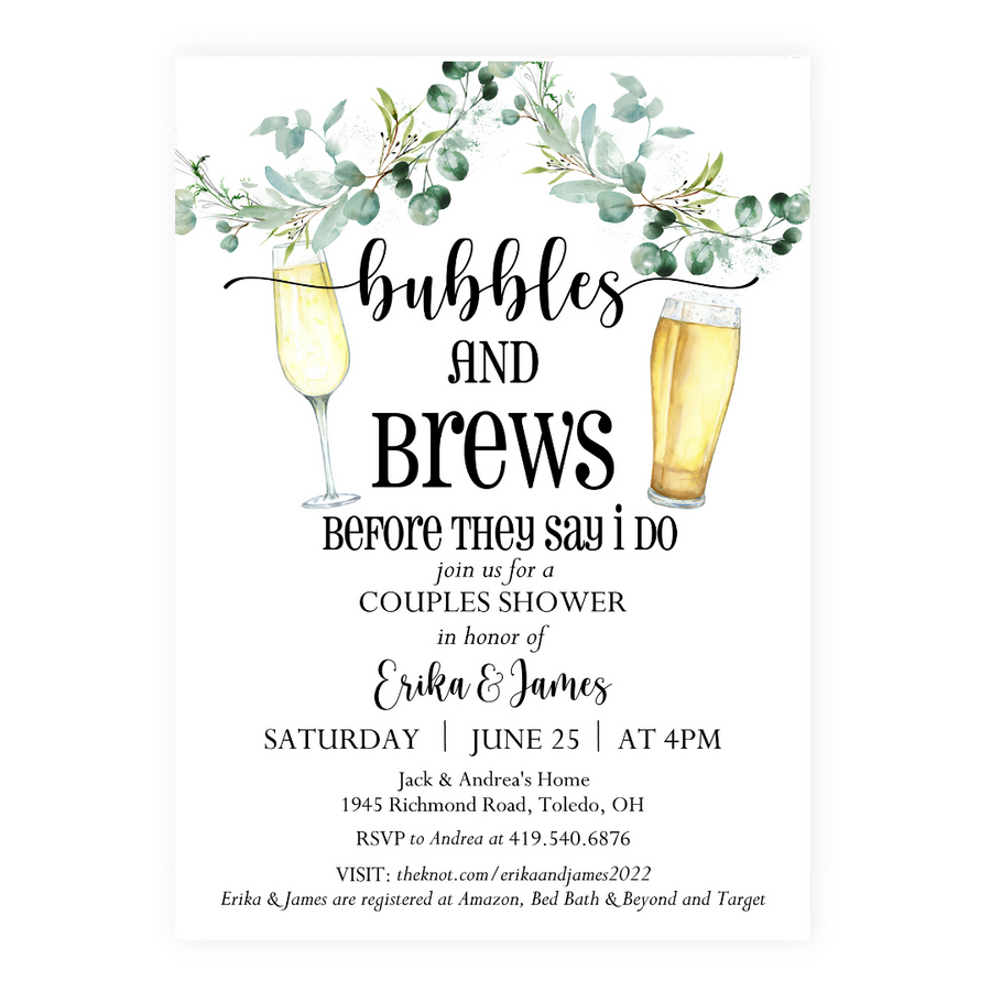 Celebrate the soon-to-be newlyweds with this playful Bubbles + Brews couples shower invite! Perfect for brunch, lunch, or an evening gathering, it’s printed on thick, textured eggshell paper. Comes with matching envelopes and the option to add a printed return address for extra convenience.