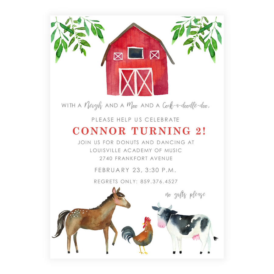 This invitation features our sweet farm animals and red barn.