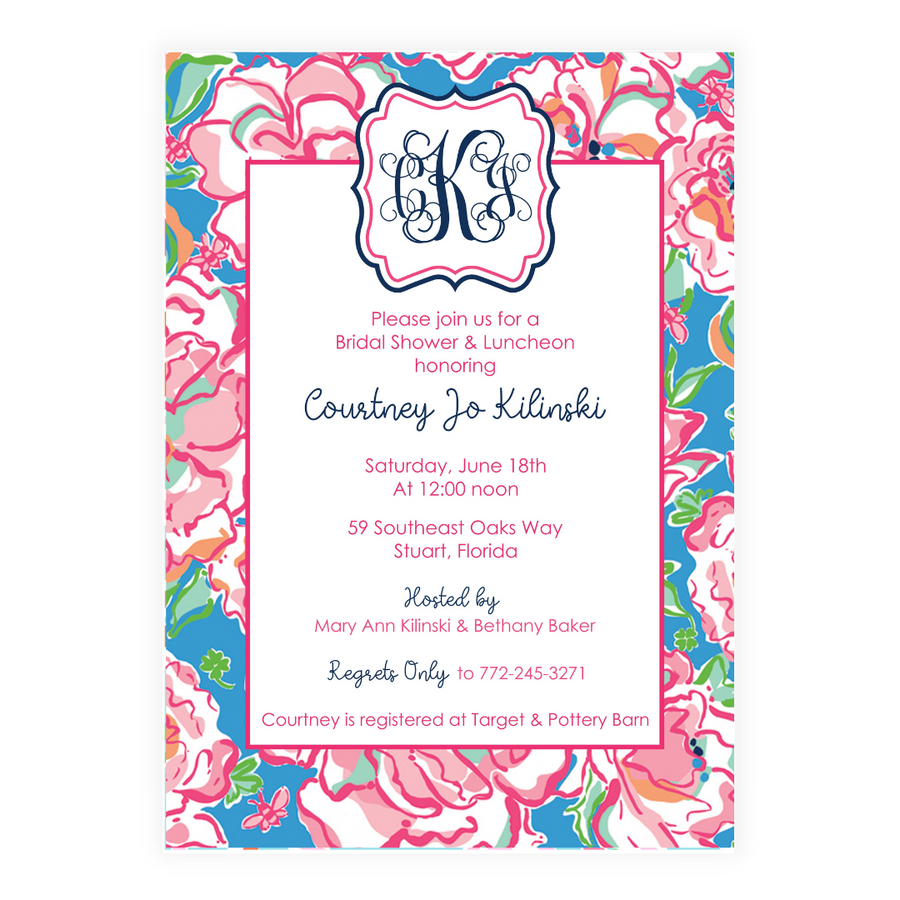 This invitation showcases a vibrant floral backdrop, combining elegance with a celebratory spirit. A prominent monogram crowns the design, framed by a refined border for a polished finish. Printed on luxurious eggshell paper with a subtle texture and substantial weight, it comes with coordinating envelopes, making it an excellent selection for a variety of events.
