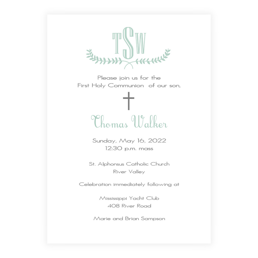 This sweet invitation is perfect for a Baptism, First Communion, or birth announcement. A simple blue laurel and a monogram to coordinate makes this design a classic!