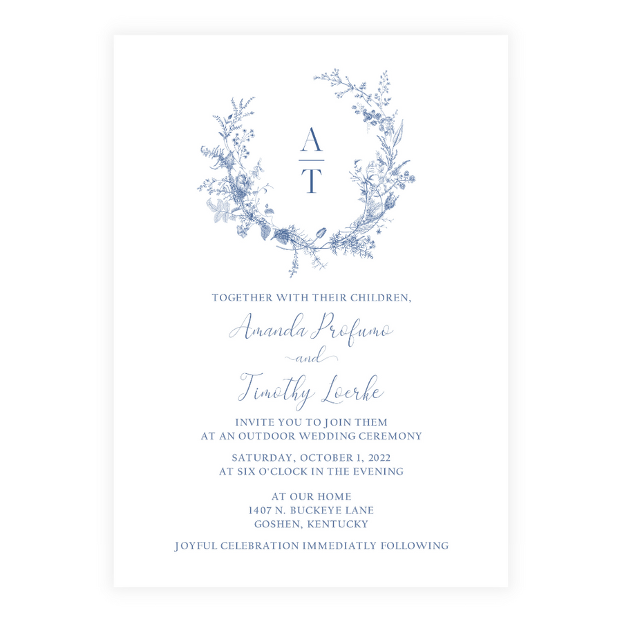 Simple Blue Wreath + Monogram Invitation