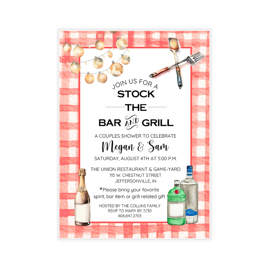 Planning a couple’s shower? This lively "stock the bar and grill" invitation is the perfect pick! Whether your party’s at a venue or your backyard, it brings a cheerful, festive vibe. Printed on lightly textured eggshell cardstock with a nice weight, it comes with matching envelopes for a complete look.