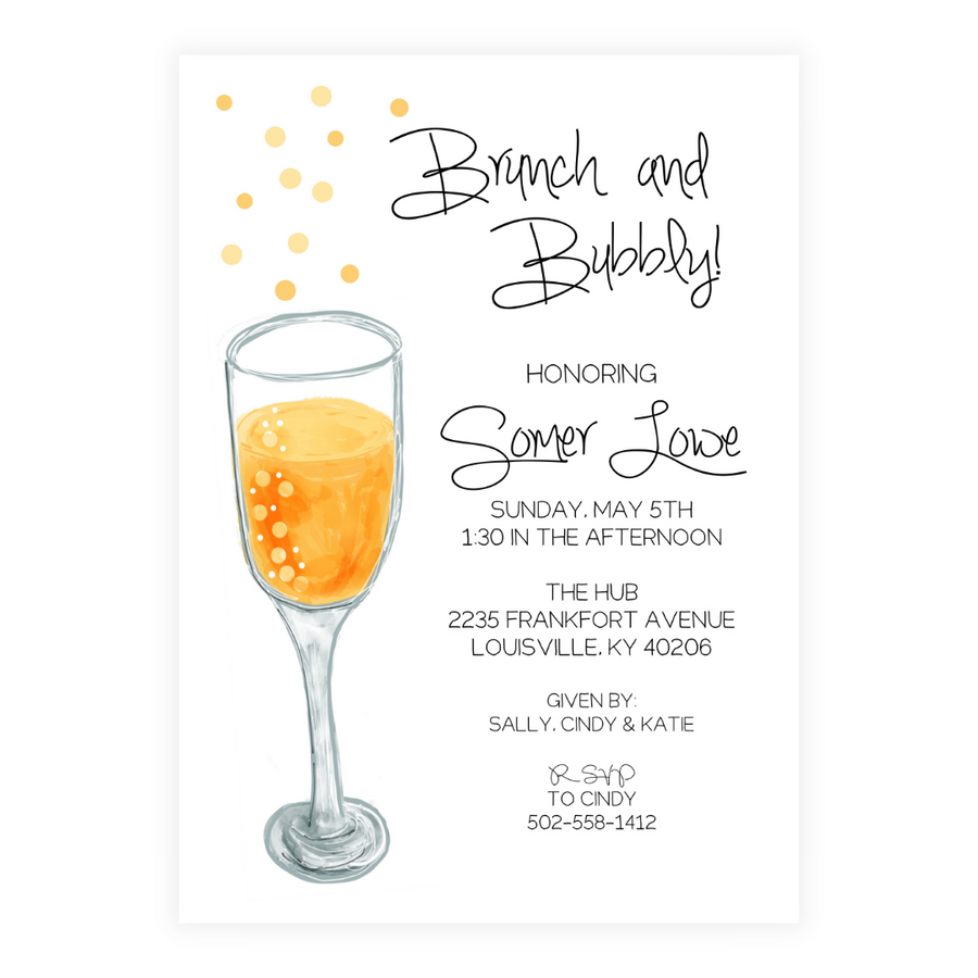 Celebrate any occasion with this brunch and bubbly invitation! Showcasing a charming watercolor champagne glass and an array of bubbles, it sets a lighthearted and joyful mood. Printed on premium eggshell paper, these invitations offer a sturdy feel with a subtle texture. Envelopes come included, with the choice to add a return address for convenience.