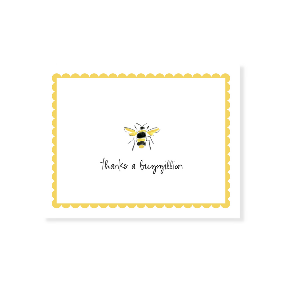 This set of 10 folded note cards is sweet and cheeky! A watercolor honeybee with a coordinating scalloped border pairs perfectly with the play on words "thanks a buzzillion!"
